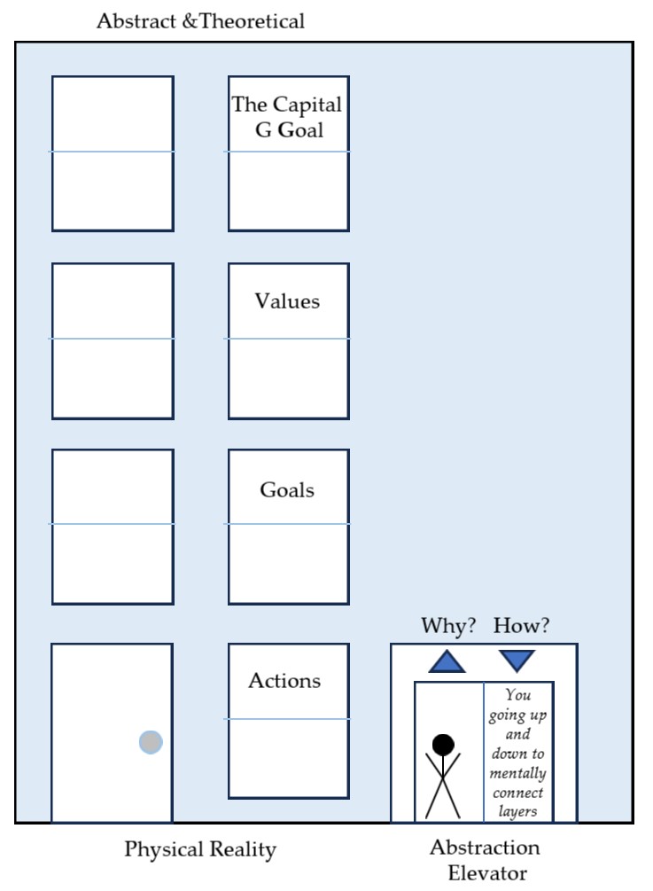 To visually connect these terms, I like to picture an “abstraction elevator” in a four-story building, with each floor getting more theoretical and removed from the world of atoms as it goes higher. The penthouse is “the Capital G Goal”; the third floor is your Values, the second floor is your goals, and the first floor is where your actions bring decisions to life. The way you move up and down floors in the abstraction elevator is as simple as pressing a button: “why” for up and “how” for down. The abstraction elevator is a framework to help you more tightly and efficiently draw connections in your brain between various abstract values and goals and the specific actions you need to take to support them. By doing this, it helps you make better decisions.