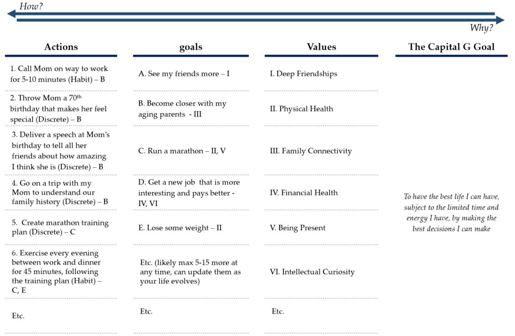 As mentioned, you will want to write down your thoughts as you go through the exercise. The outcome of the exercise is to codify your values, goals, and actions in a table containing three lists. On the left side is Actions (with each labeled as “discrete” or “habit”), the middle contains Goals, and the Right contains Values. It may make sense to label each row (using numbers for Actions, letters for Goals, and roman numerals for Values) so that you can identify which goals support which values, etc.